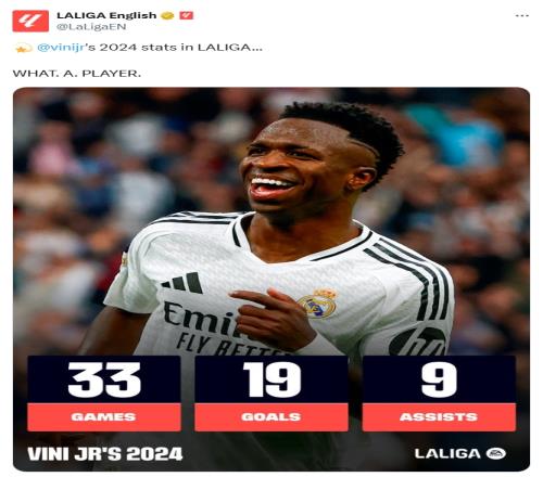 西甲官方配文写道:“维尼修斯的2024西甲数据……多么出色的一名球员!”