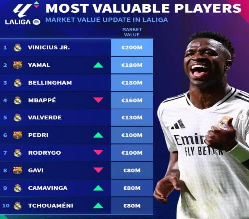 德转列西甲身价最贵榜:维尼修斯亚马尔领衔,皇马7将巴萨3人