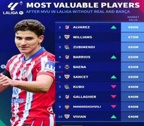 体育资讯12月30日报道宣称 《转会市场》近日更新西甲球员身价,并列出了皇萨之外的西甲球员最贵榜,马竞毕巴各3将。