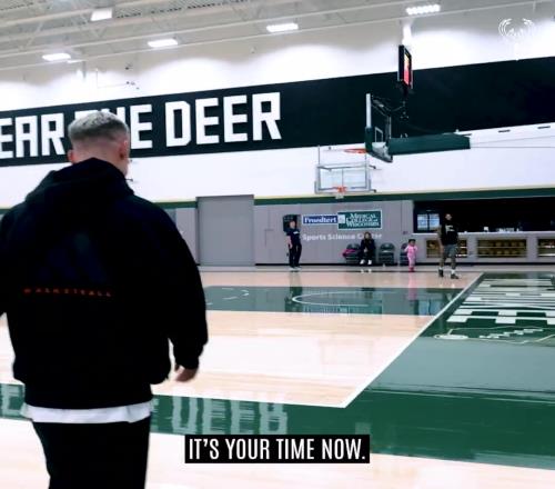 奥尔莫拜访雄鹿与利拉德互动,互赠球衣球鞋&秀篮球技术