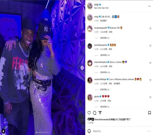 与蕾哈娜合影!维尼修斯社媒晒纽约度假照片