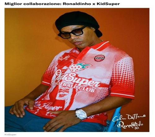 评语:这里有史上最具想象力的球员之一,这里有一个总是知道如何进行实验的品牌,这里有讽刺意味,当然还有将运动语言运用到休闲服饰中的高超技巧。KidSuper在与罗纳尔迪尼奥的合作中可谓一针见血:选择这位前巴塞罗那和巴西国家队的10号球员作为灵感来源,推出了一系列产品,包括运动服、球衣,甚至还有印有巴西人最著名进球之一的卡通图案的毛衣。有趣而令人惊讶。