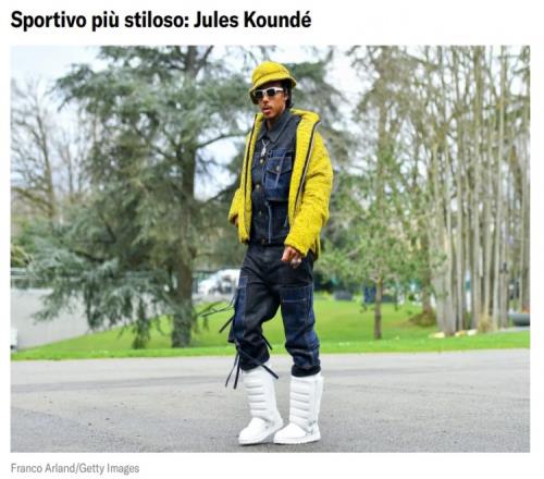 评语:在巴塞罗那,他们按照Nba的路线,孔德继续以其令人眼前一亮的装扮风靡一时,并赢得了“最佳球员着装奖”。这证明足球运动员在时尚界大放异彩,成为时尚偶像和灵感源泉。在细高跟鞋、运动风造型、另类的Bloke Core装束和大胆的奢华之间,孔德给人们都树立了更高的标杆。