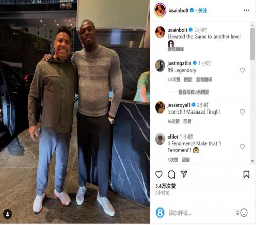 博尔特在社交媒体上晒出与罗纳尔多的合照,配文:“将足球提升到另一个水平。”