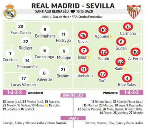 体育资讯12月22日报道宣称 北京时间今天晚上23点15分,皇马将在西甲第18轮比赛中主场对阵塞维利亚。西班牙媒体《马卡报》预测了两队的首发阵容,罗德里戈、姆巴佩、迪亚斯组成皇马锋线三叉戟。