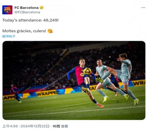 巴萨确认,此役共有46249名观众来到蒙锥克体育场观赛,巴萨官方社媒对前来观赛的球迷表示感谢。