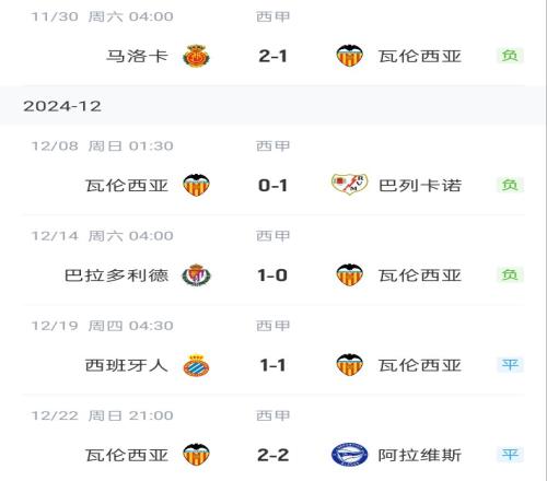 体育资讯12月23日报道宣称 西甲第18轮,瓦伦西亚主场2-2战平阿拉维斯,近5场联赛3负2平。