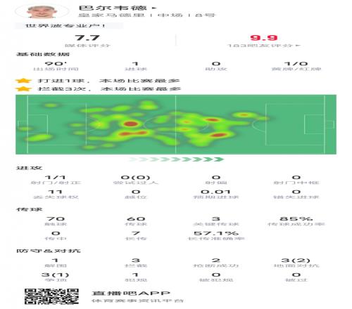 巴尔韦德本场数据:1世界波3关键传球3拦截2抢断,评分7.7