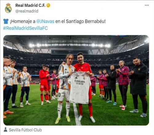 皇马本轮主场迎战塞维利亚,这也是塞维利亚传奇球员纳瓦斯的生涯告别战。赛前,双方列队向纳瓦斯致敬,而莫德里奇也向纳瓦斯赠送了皇马签名球衣。