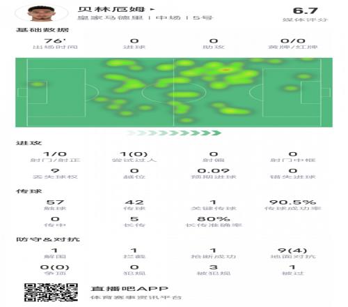 贝林厄姆本场比赛具体数据如下: