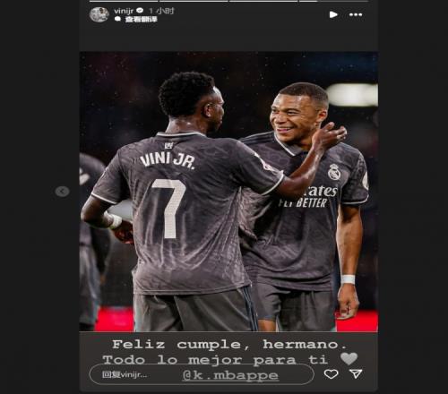 体育资讯12月20日报道宣称 姆巴佩在今日迎来26岁生日,队友维尼修斯通过社媒送上祝福。