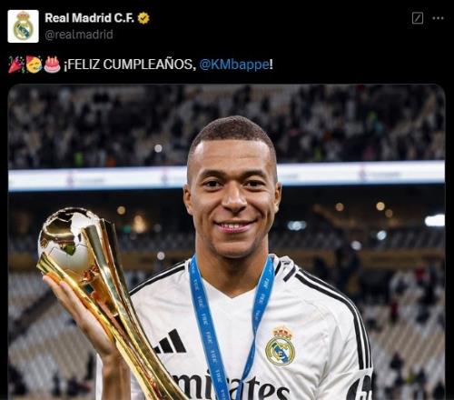皇马官方晒出了一张姆巴佩捧着洲际杯冠军奖杯的照片,并送上了生日快乐的祝福。