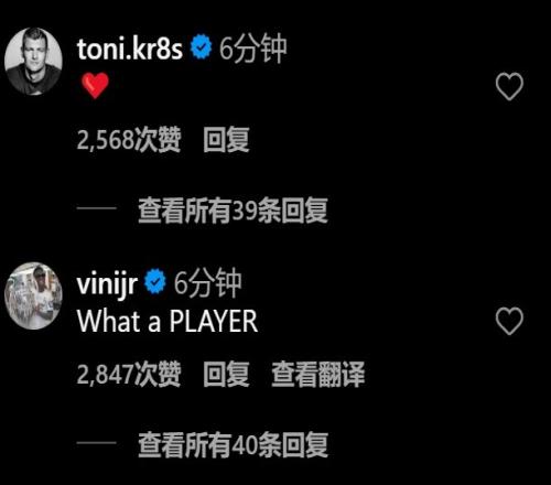 在评论区,克罗斯和维尼修斯也称赞了贝林厄姆。