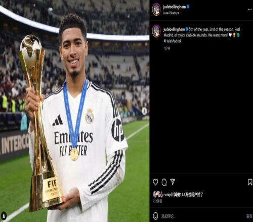 贝林晒出自己捧杯时的照片,并配文:今年的第5冠,本赛季第2冠!皇马是世界上最好的俱乐部,我们还想要更多!