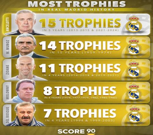 据统计,安切洛蒂执教皇马已经15次夺得冠军,超越穆尼奥斯独居队史第一。