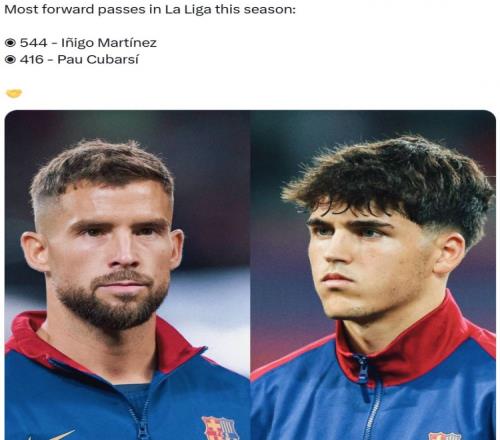 而数据统计显示,巴萨两位中卫伊尼戈-马丁内斯(544次)和库巴西(416次)的向前传球数,也分列本赛季西甲前二。