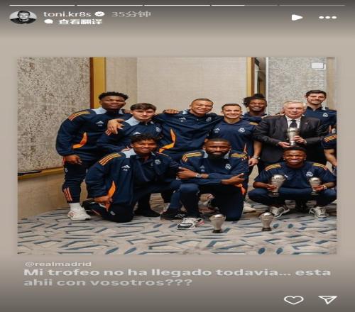 克罗斯社媒晒出了皇马在颁奖仪式结束后,全队和奖杯的合照,并表示道:我的FIFA最佳阵奖杯没收到,是在你们那吗?