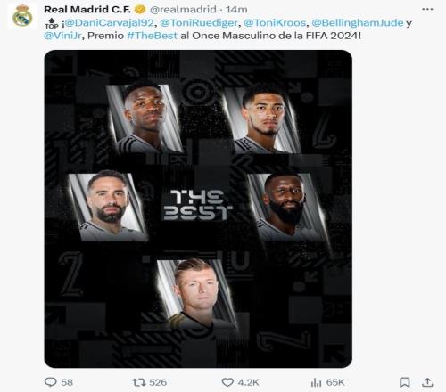 体育资讯12月18日报道宣称 FIFA年度颁奖,官方公布了FIFA2024年度最佳阵容。皇马一共有5名球员入围。