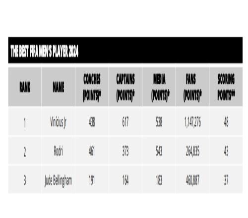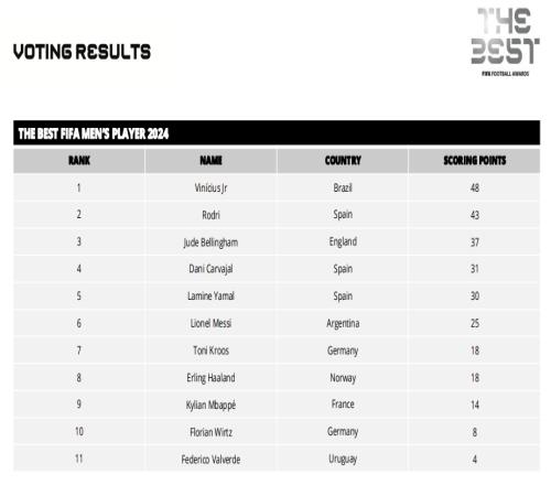 FIFA最佳得票:维尼修斯48分第一,罗德里贝林排名二三,梅西第六