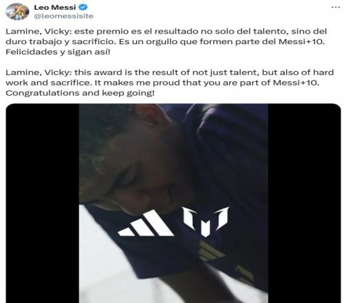 梅西官推用西班牙语和英语祝贺道:“拉明和薇基:这一奖项不仅是你们天赋的结晶,更证明了你们的努力和付出。很自豪你们是‘梅西+10’的一员,祝贺你们并继续努力吧!”