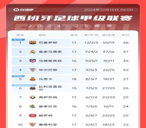 积分榜方面,巴萨38分领跑,皇马37分暂排第二,马竞少赛一场35分暂排第三。