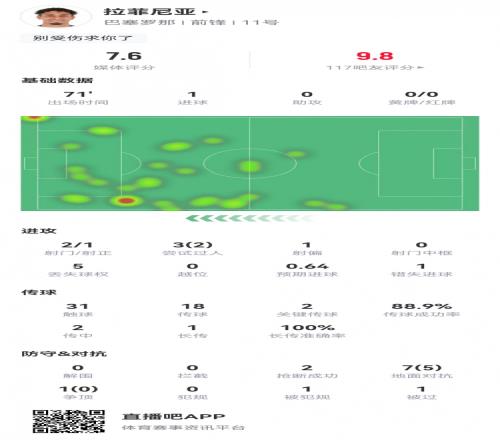 拉菲尼亚数据:2射1正1进球,2次关键传球,1次错失进球,评分7.6