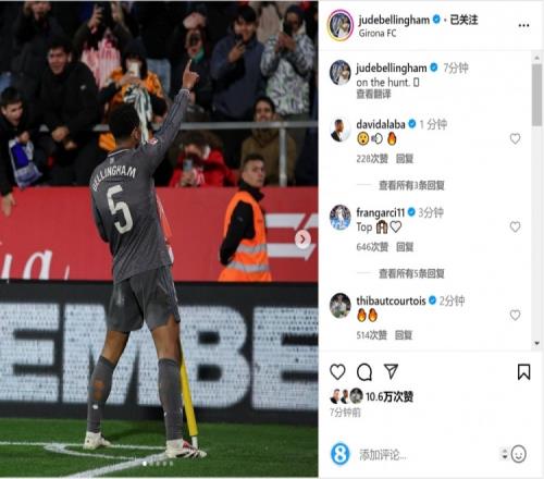 赛后贝林厄姆在社交媒体上晒出庆祝进球的照片,并配文:“在狩猎中。”