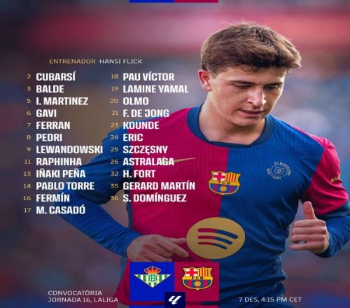 体育资讯12月7日报道宣称 本轮西甲,12月7日23点15分,巴萨将在客场对阵皇家贝蒂斯。赛前,巴萨公布本场名单。莱万、亚马尔领衔名单。