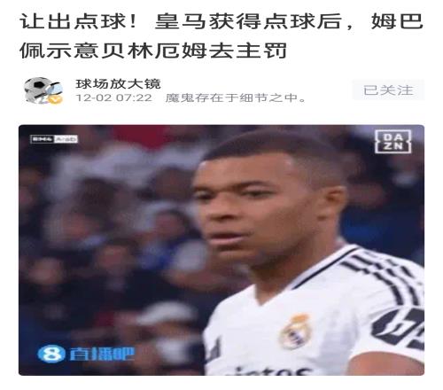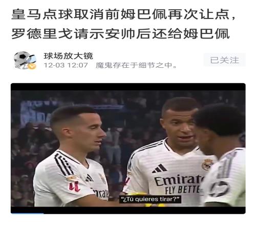 上轮联赛,皇马在比赛中两次获得点球(其中第二个被取消)。第一次获点,姆巴佩示意贝林厄姆取主罚,贝林厄姆也轻松罚进。第二次获点,姆巴佩示意罗德里戈去主罚,罗德里戈向安切洛蒂请示后,又把球还给姆巴佩表示还是他去罚。