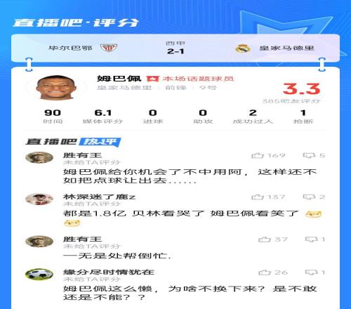 吧友给姆巴佩只打了3.3分,调侃他不如让出点球主罚权。