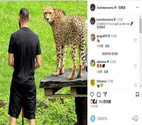 体育资讯12月3日报道宣称 本泽马更新社媒动态,晒出自己与猎豹的同框照片。