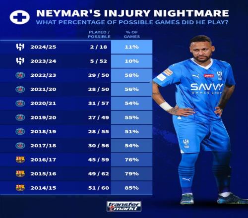 体育资讯11月9日报道宣称 内马尔复出后参加2场比赛再次受伤,德国转会市场统计了他2014-2015赛季以来的出场率,他在利雅得新月的两个赛季出场率最低。