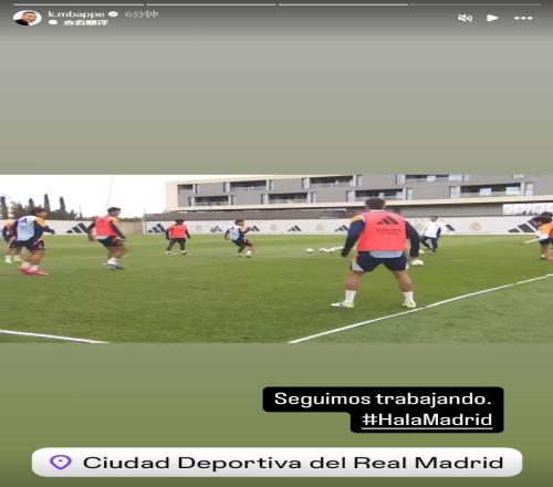 姆巴佩为视频配文:“我们继续努力工作,Hala Madrid”