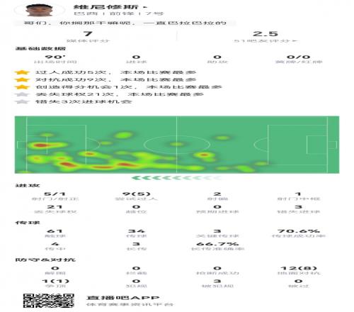 维尼修斯数据:5射1正,1次中框,1次造点+失点,3次错失良机