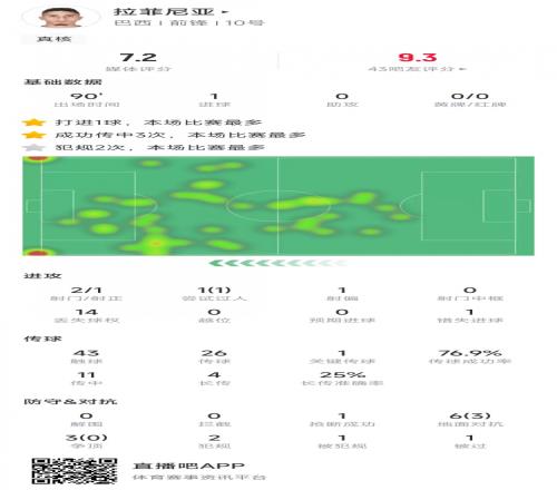 拉菲尼亚数据:任意球破门+11次传中,传球成功率76.9%&获评7.2分
