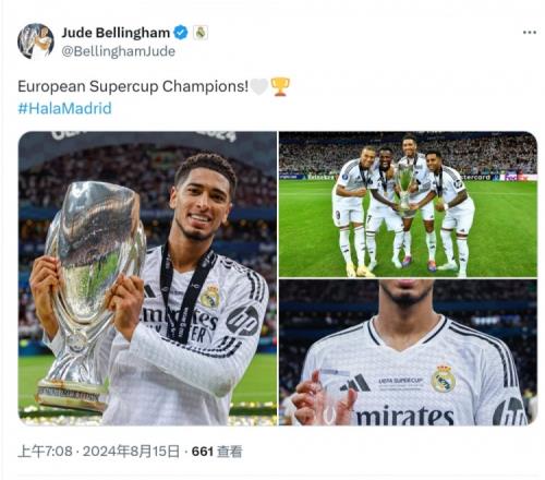 体育资讯8月15日报道宣 皇马中场贝林厄姆更新社媒动态,庆祝欧超杯夺冠。