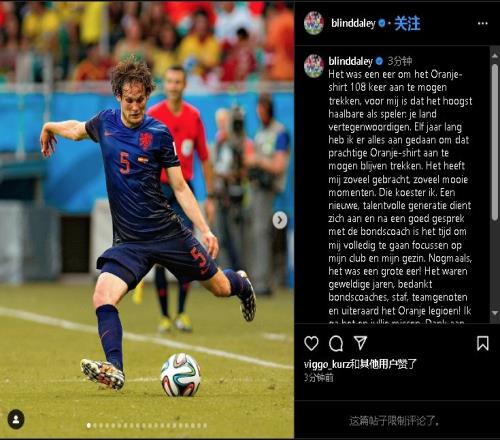 体育资讯8月14日报道宣 34岁荷兰中卫布林德在社媒宣布,自己从荷兰国家队退役,结束11年国家队生涯。