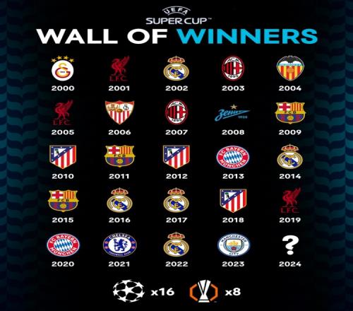 体育资讯8月13日报道宣 北京时间8月15日凌晨3点,皇马和亚特兰大将在欧洲超级杯中展开较量。欧冠官方社媒列出了历届欧超杯冠军球队(改制后),其中欧冠冠军16次问鼎,欧联杯冠军8次夺魁。