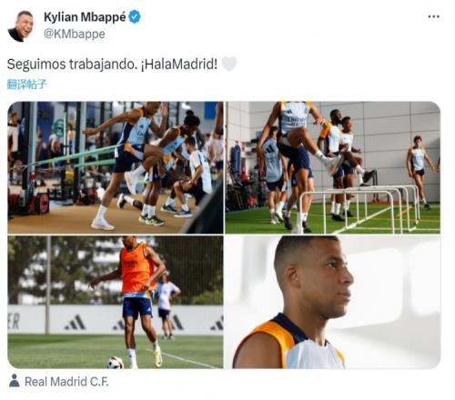 姆巴佩在社媒晒出今天训练的照片,并配文:“继续工作,Hala Madrid”。