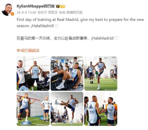 姆巴佩晒出训练照并配文写道:“在皇马的第一天训练,全力以赴备战新赛季,¡HalaMadrid!