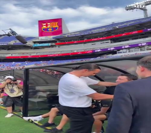 季前热身赛,巴萨与米兰交手,目前在米兰任职的伊布与巴萨替补席打招呼,他球员生涯曾于2009-10赛季在巴萨踢球。