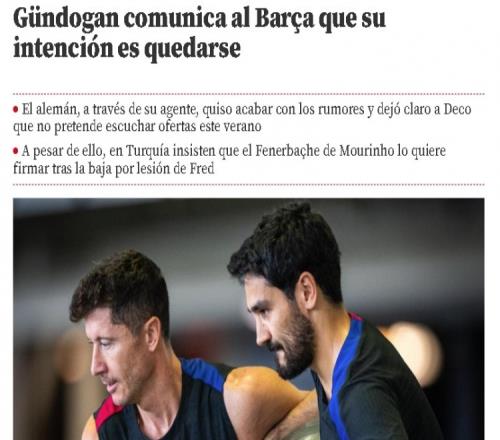西媒表示,京多安的经纪人向巴萨体育总监德科表示,球员不打算听取任何转会报价。