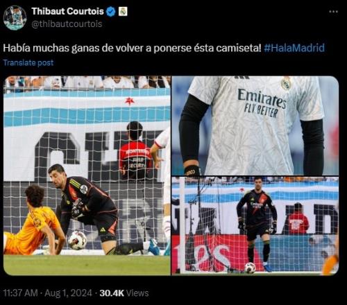库尔图瓦写道:“我真的很高兴能再次穿上这件球衣!Hala Madrid!”