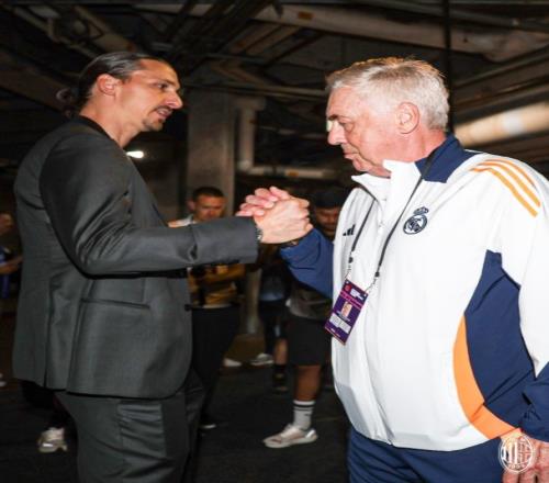 季前热身赛,米兰对阵皇马,正在米兰任职的伊布与皇马主帅安切洛蒂致意,米兰官方也晒出两人的照片,并配文:“这两位。”