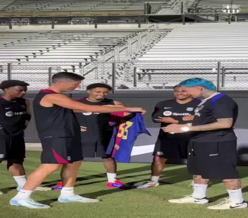 体育资讯7月30日报道宣称 巴萨官方更新社媒动态,晒出莱万等球员向阿根廷音乐人赠送巴萨球衣的视频。