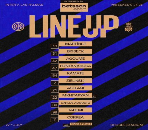 国米首发:13-J-马丁内斯、31-比塞克、42-阿戈梅、47-丰塔纳罗萨、54-卡马特、7-泽林斯基、21-阿斯拉尼、22-姆希塔良、30-奥古斯托、99-塔雷米、11-科雷亚