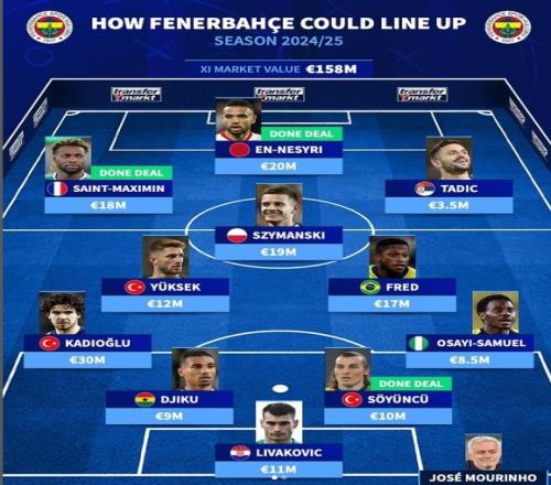 体育资讯7月26日报道宣称 费内巴切在此前已经签下了塞维利亚中锋恩内斯里,《转会市场》也预测了穆帅可能在新赛季排出的主力阵容。