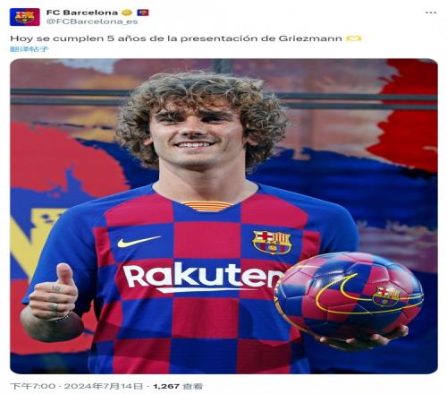 体育资讯7月14日报道宣称 5年前的今天,格列兹曼加盟巴萨。