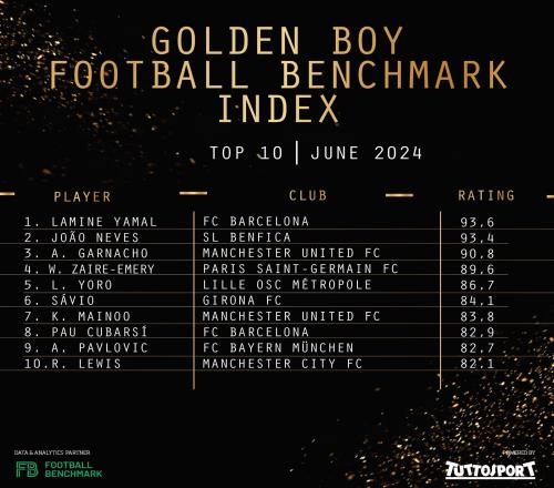此外,在6月份金童奖官方公布的表现评分上,亚马尔也是排名第一。
