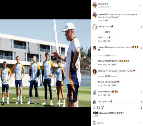 安切洛蒂上传了训练课照片,并配文写道:“我们带着一如既往的渴望和激情回来了,加油皇马!”